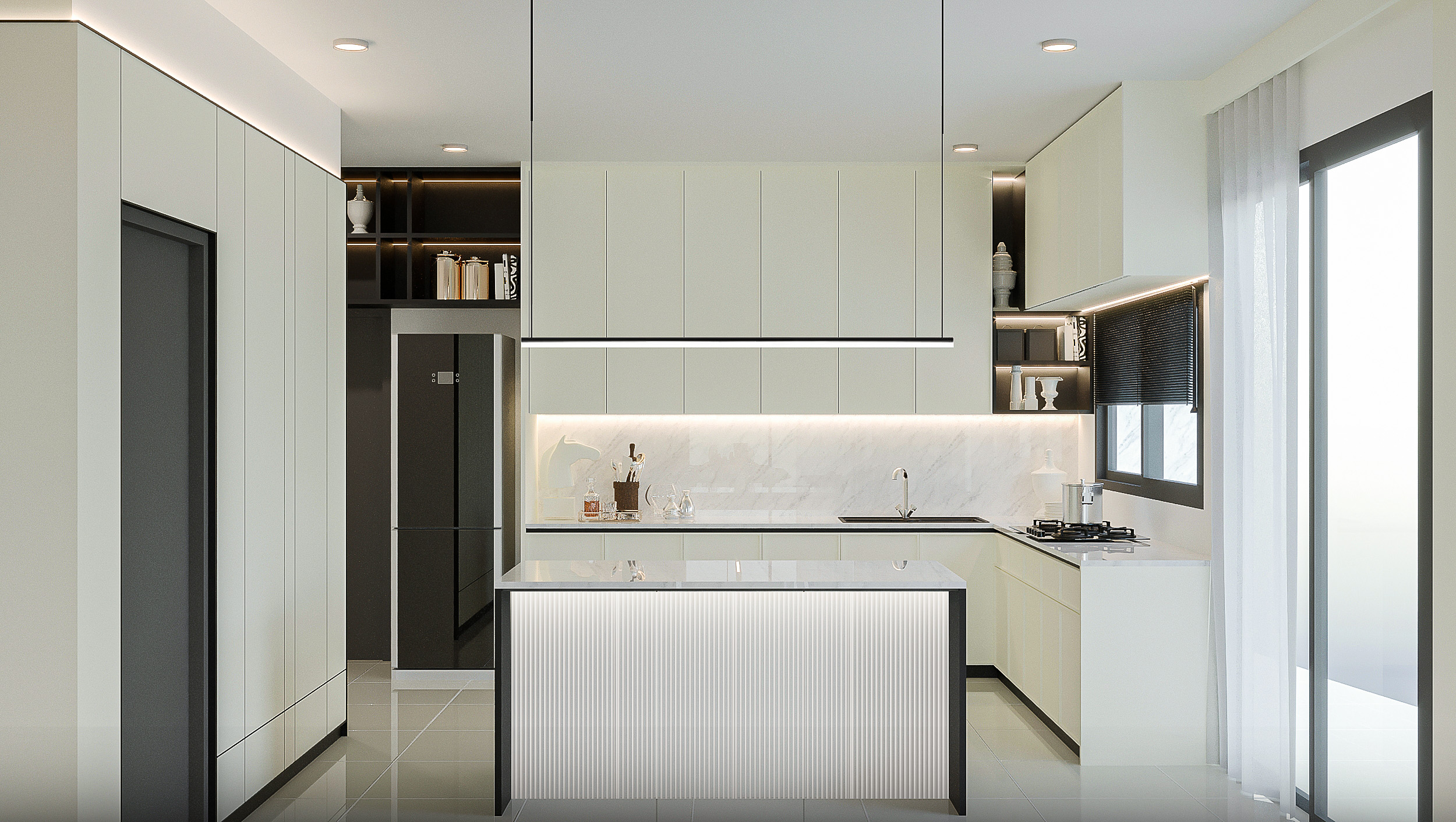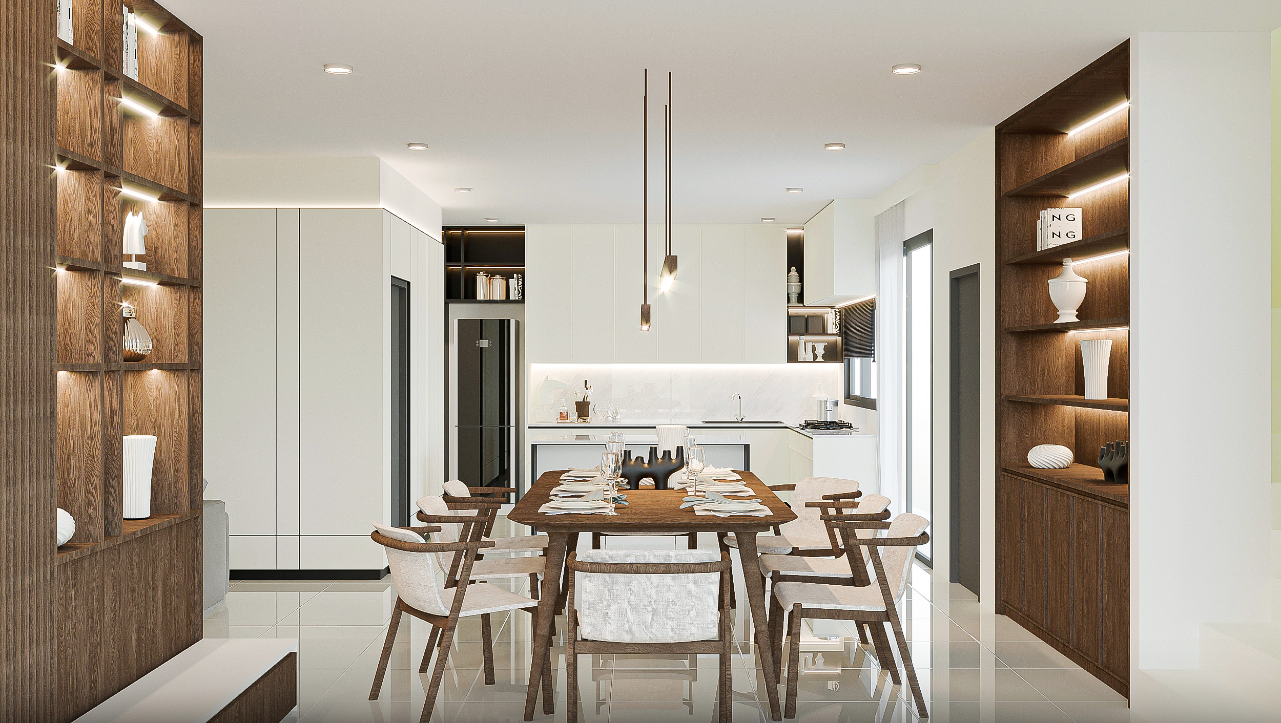 งานออกแบบตกแต่งภายในบ้านภายใต้แนวคิด Modern Elegance ถ่ายทอดความงดงามของการอยู่อาศัยแบบร่วมสมัย ผ่านการผสมผสานองค์ประกอบที่หลากหลายทั้งในด้านการเลือกใช้วัสดุ รายละเอียดงานออกแบบ และการจัดวางพื้นที่ ผู้ออกแบบให้ความสำคัญกับการสร้างมิติและบรรยากาศที่ไม่เพียงดูทันสมัย แต่ยังแฝงไปด้วยความอบอุ่น เรียบหรู และเป็นกันเอง เพื่อให้ทุกพื้นที่ของบ้านสามารถรองรับการใช้ชีวิตประจำวันและช่วงเวลาพิเศษของทุกคนในครอบครัวได้อย่างสมดุล