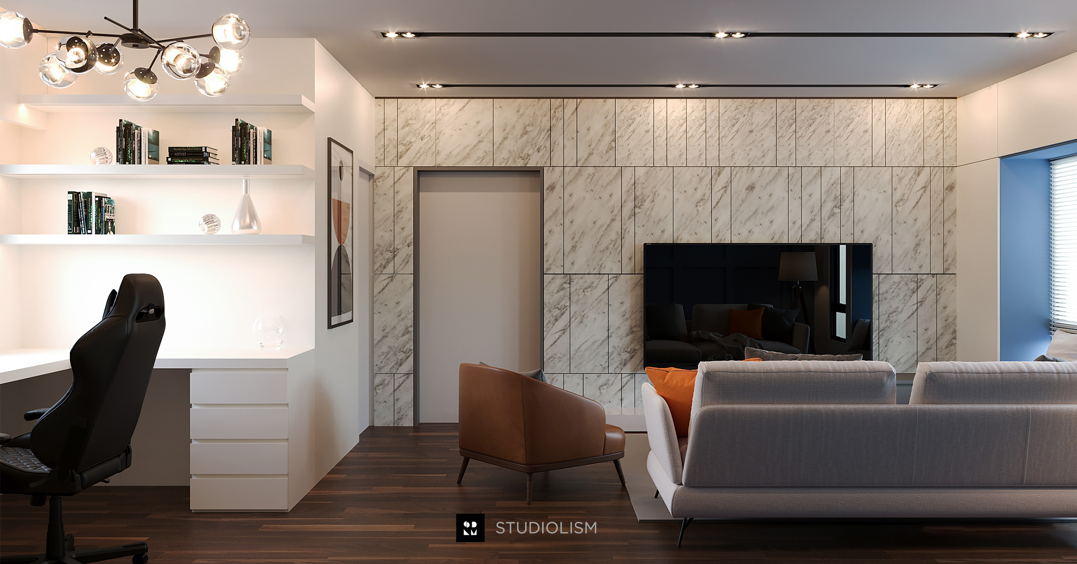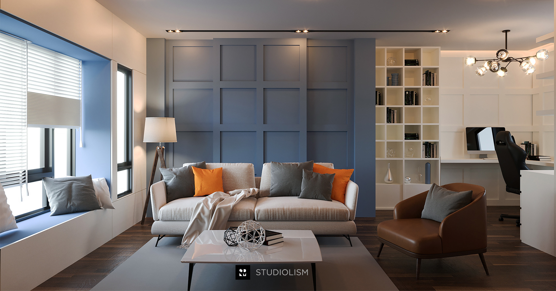 งานออกแบบตกแต่งภายในบ้านหลังนี้เริ่มต้นจากการปรับผังพื้นที่ โดยรวมพื้นที่ของห้องนอนสองห้องเข้าด้วยกัน เพื่อสร้างเป็นห้องทำงานที่ผสานการใช้งานร่วมกับพื้นที่นั่งเล่นแนวคิดการออกแบบมุ่งเน้นการใช้เส้นสายและรูปทรงเรขาคณิตโดยเฉพาะรูปทรงสี่เหลี่ยม ผสานกับโทนสีฟ้าคราม เพื่อสะท้อนบรรยากาศของการอยู่อาศัยที่ผ่อนคลายและสอดคล้องกับวิถีชีวิตในช่วงเวลาปัจจุบัน