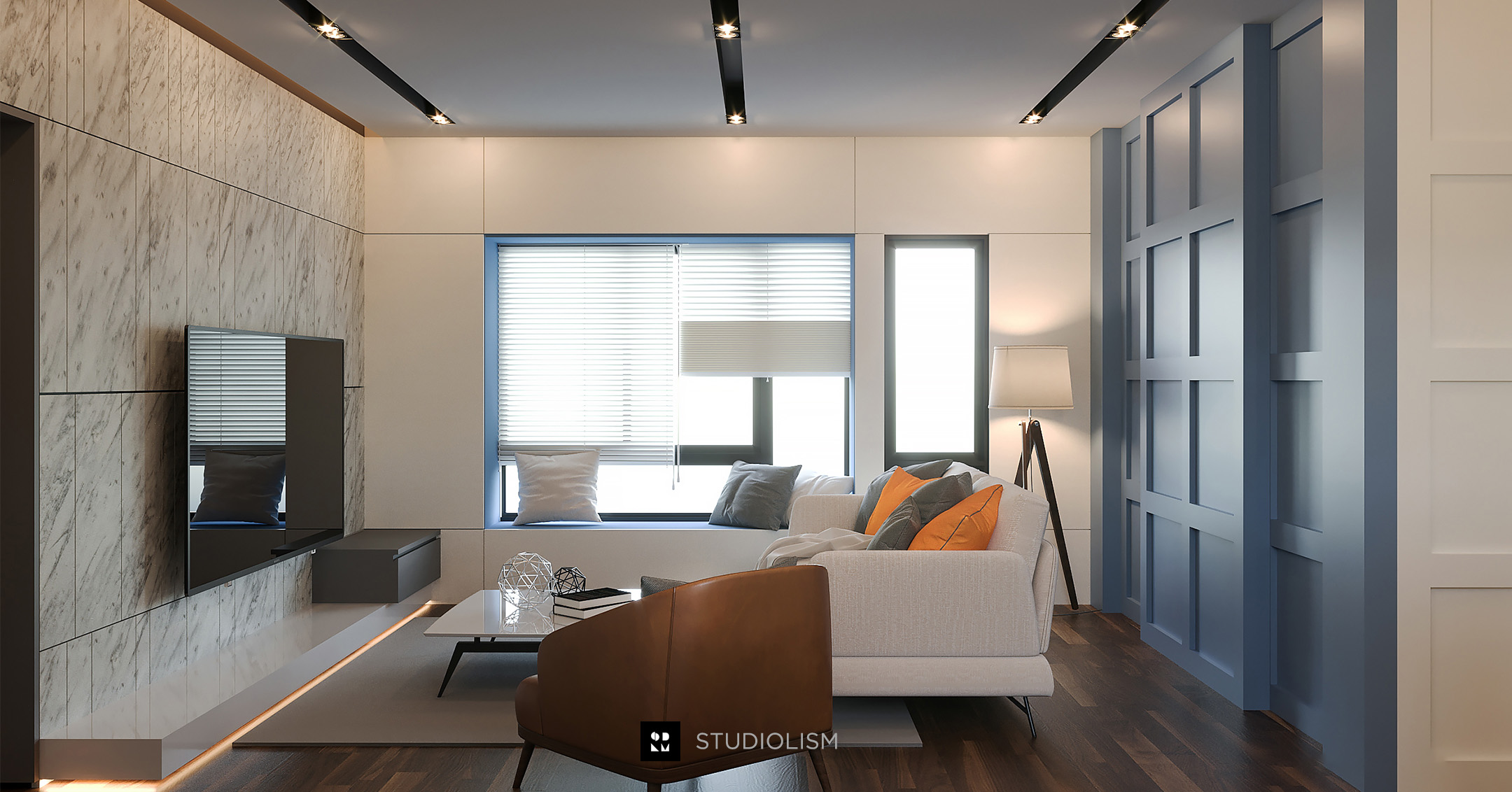 House_96 interior design project begins with the reconfiguration of the layout by combining two bedrooms into a single multifunctional space that serves as both a home office and a living area. The design emphasizes clean lines and geometric forms, particularly rectangular shapes, combined with turquoise tones to express a relaxed living atmosphere that reflects contemporary lifestyle and present-day