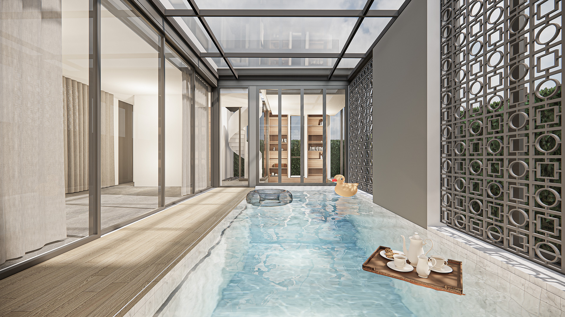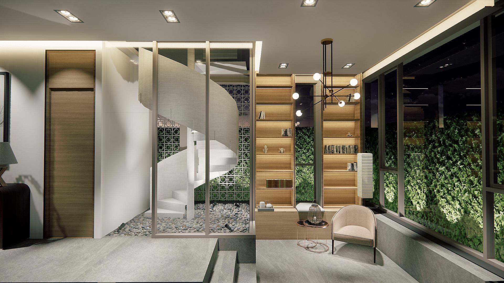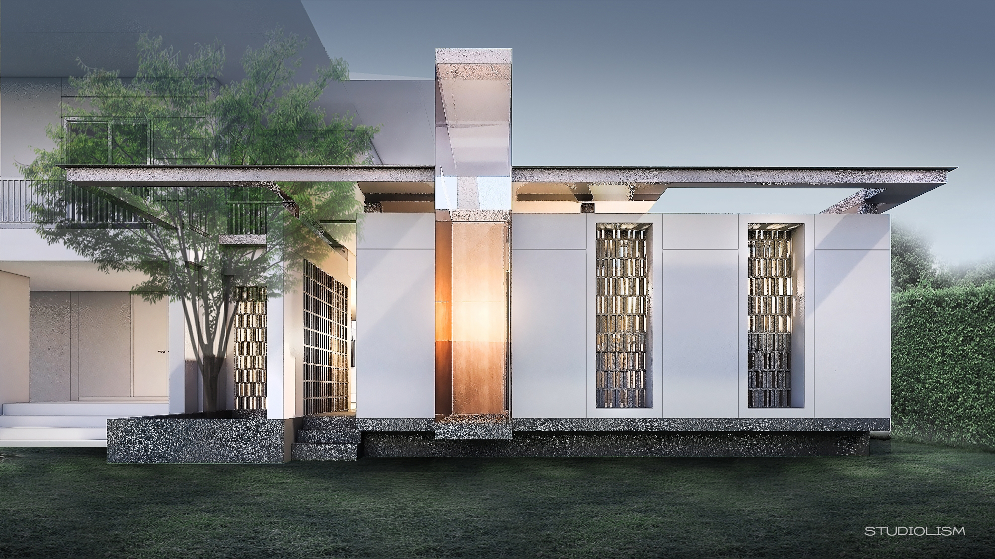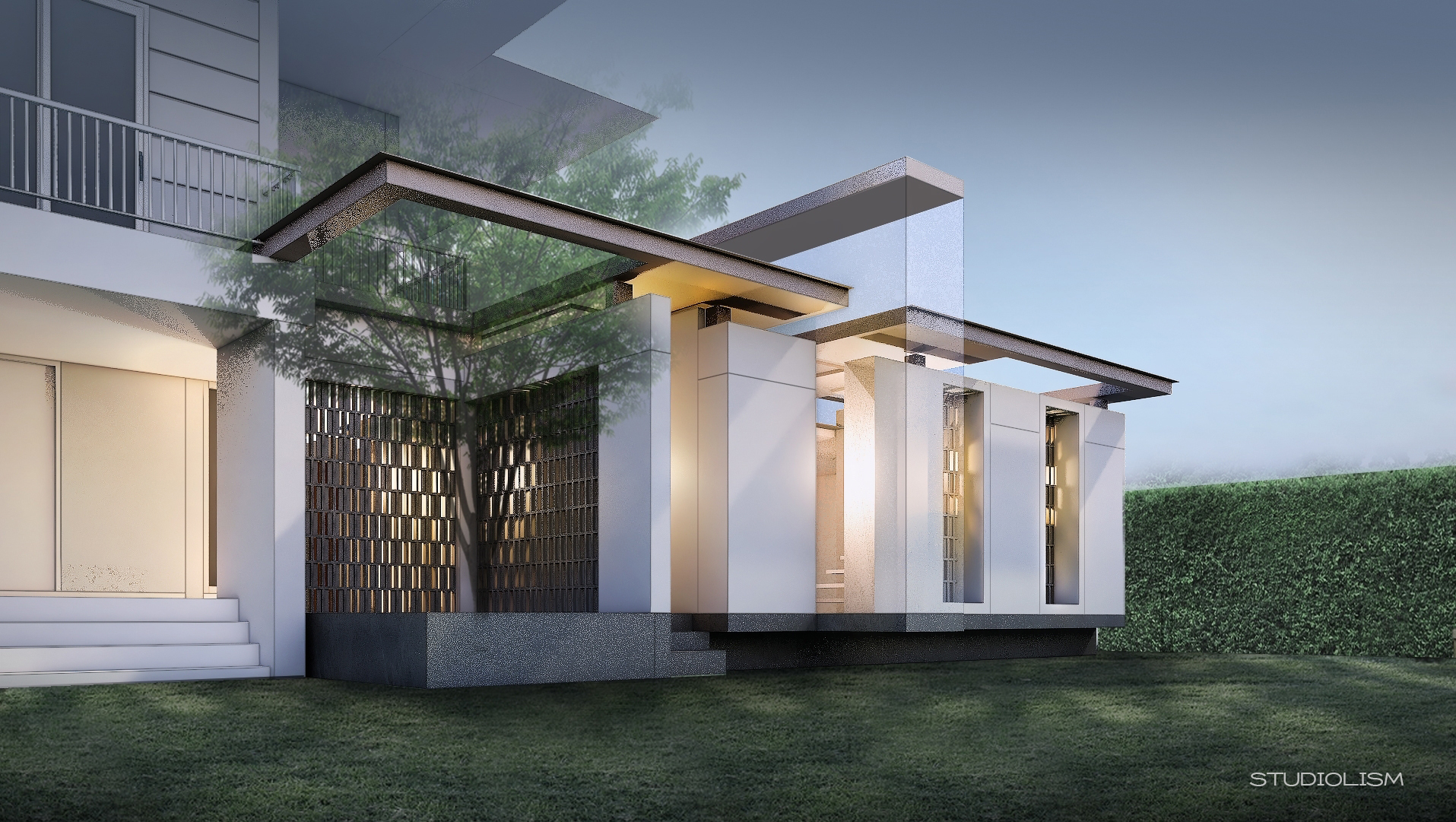 เนื่องจากบ้านไม่ใช่เพียงพื้นที่ส่วนตัวเท่านั้น เจ้าของโครงการจึงต้องการเพิ่มพื้นที่ใช้งานสำหรับเป็นจุดพบปะสังสรรค์ พร้อมสระว่ายน้ำภายในตัว ผู้ออกแบบจึงมีแนวคิดสร้างสรรค์สถาปัตยกรรมให้โดดเด่นและน่าจดจำ ผ่านรูปทรงแท่งแก้วด้านหน้าอาคารนอกจากนี้ การออกแบบยังคำนึงถึงการจัดสรรพื้นที่ภายในอาคารที่ต่อเติม โดยแยกโซนส่วนรวมและส่วนบุคคลอย่างชัดเจน เพื่อรองรับกิจกรรมที่หลากหลายและตอบสนองความต้องการของผู้ใช้งานได้อย่างเต็มประสิทธิภาพ