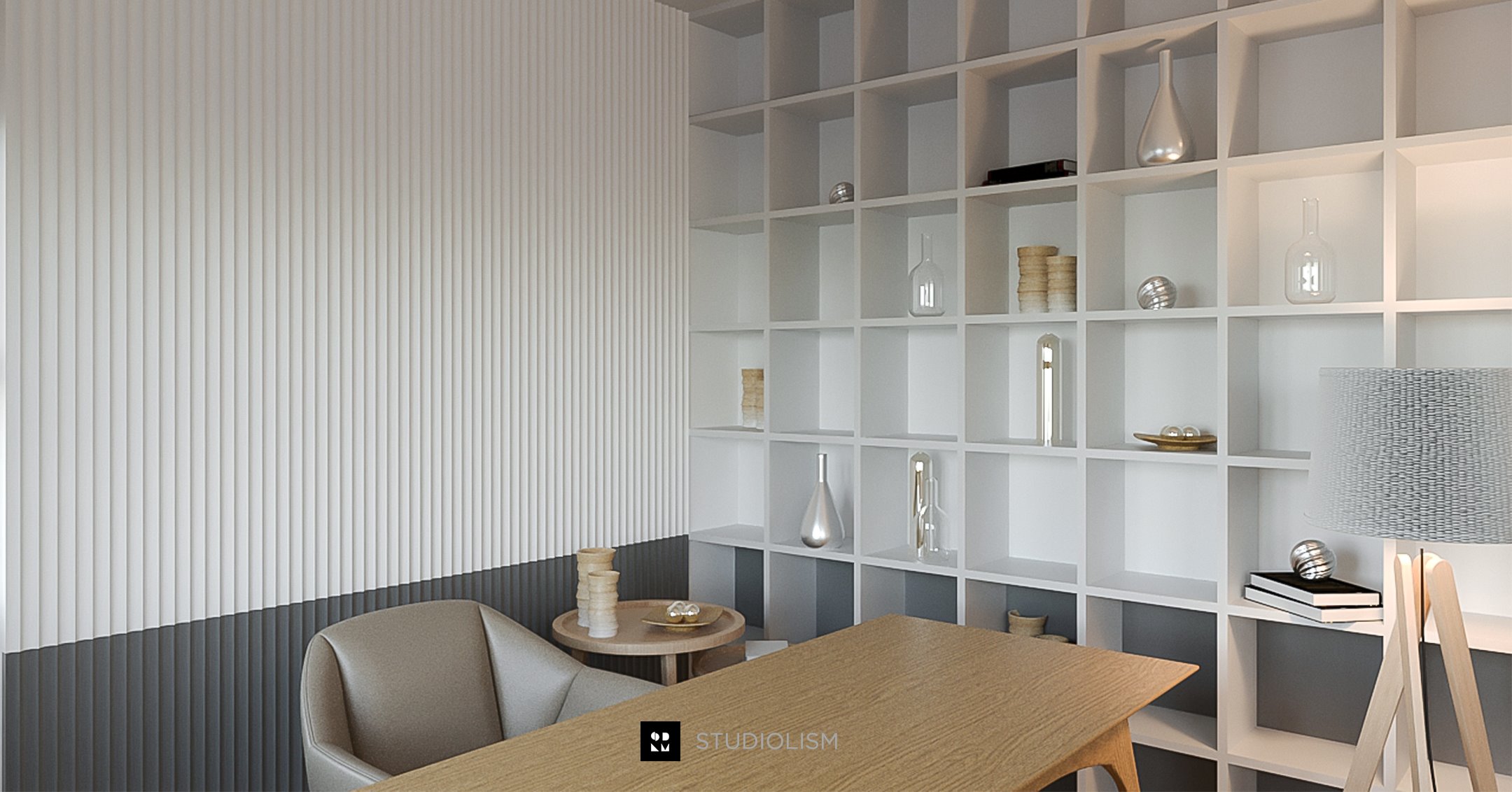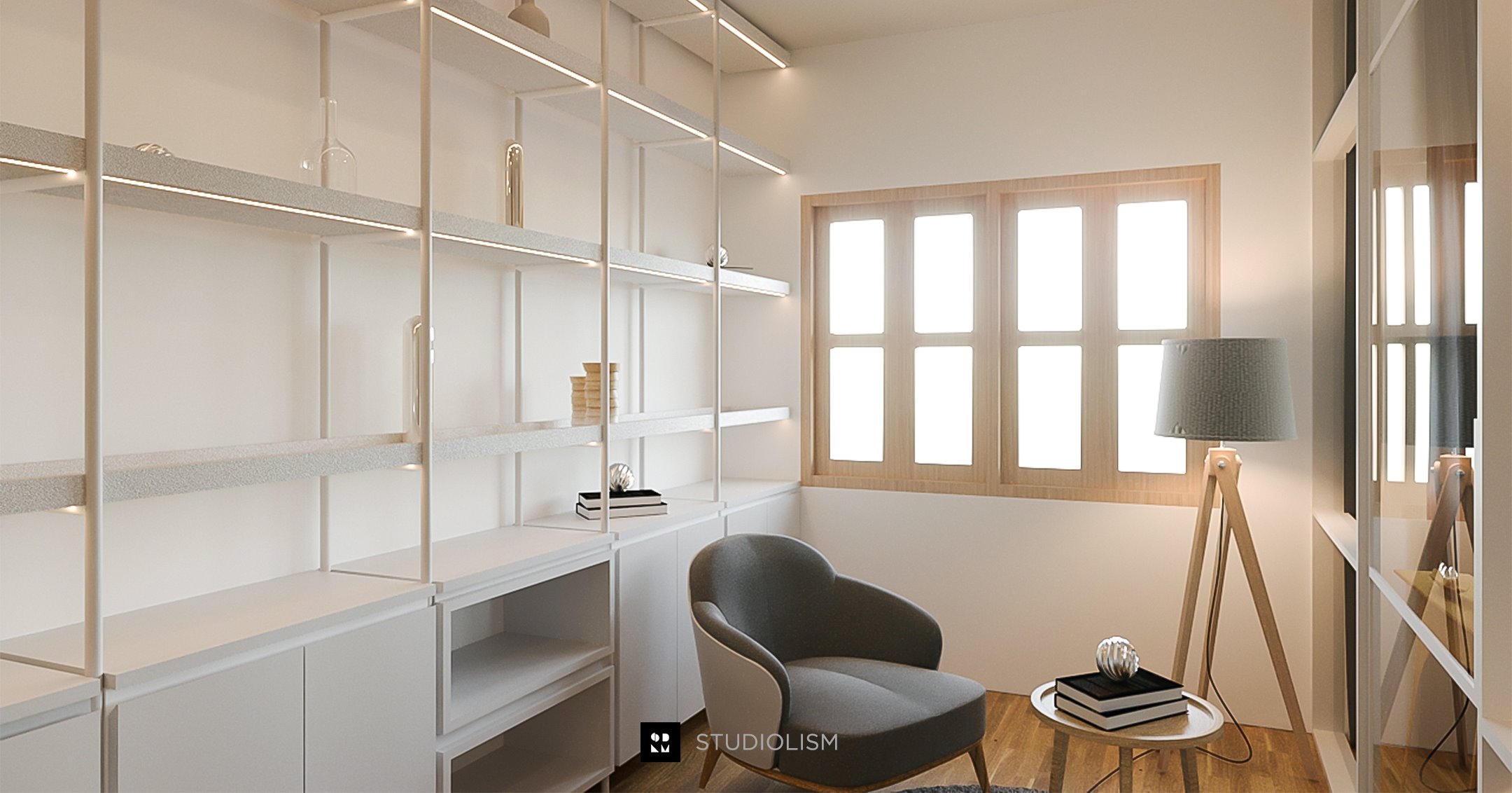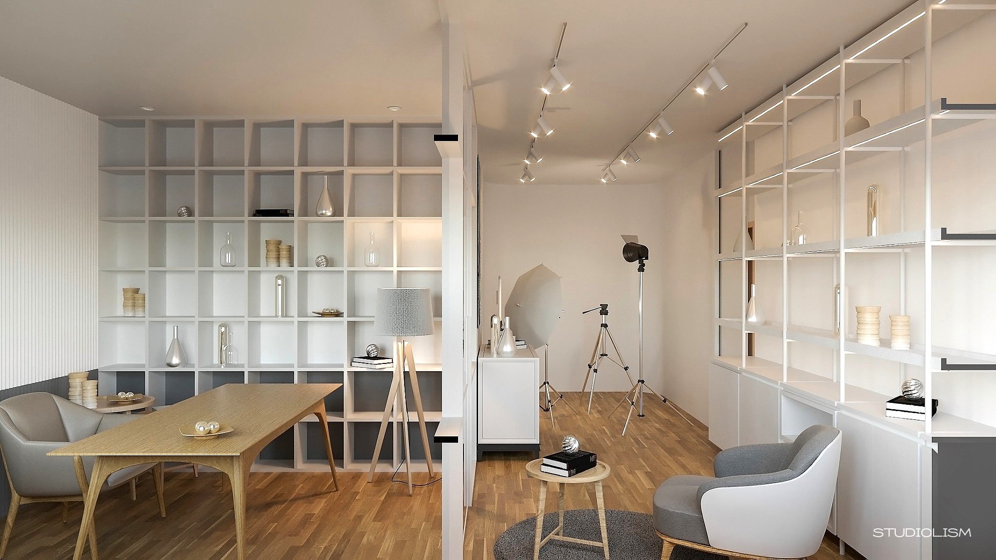 งานออกแบบภายในห้องสตูดิโอนี้เน้นการใช้งานที่ยืดหยุ่น ทั้งในเรื่องของอุปกรณ์และมุมมองต่าง ๆ ผู้ออกแบบจึงเลือกใช้แนวคิด Open Plan เพื่อรองรับกิจกรรมที่หลากหลาย พร้อมให้ความสำคัญกับการใช้ เฟอร์นิเจอร์ลอยตัว เป็นหลัก เพื่อความสะดวกในการปรับเปลี่ยนฉากและอุปกรณ์ในระหว่างการถ่ายทำโทนสีของเฟอร์นิเจอร์ถูกเน้นไปที่ ขาว–เทา เพื่อให้สามารถปรับแต่งและใช้งานได้อย่างยืดหยุ่นตามความต้องการของผู้ใช้งานในอนาคต
